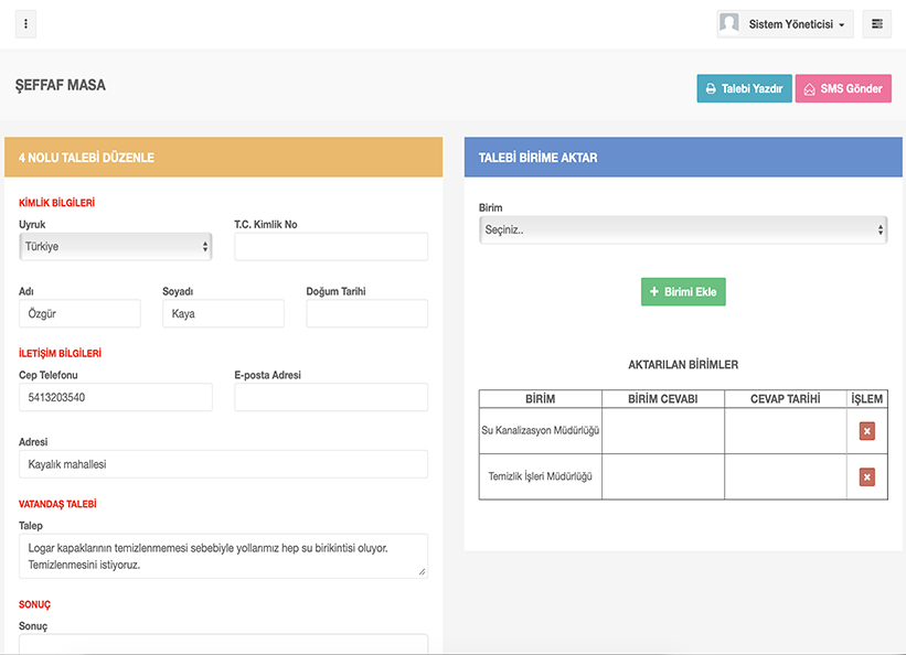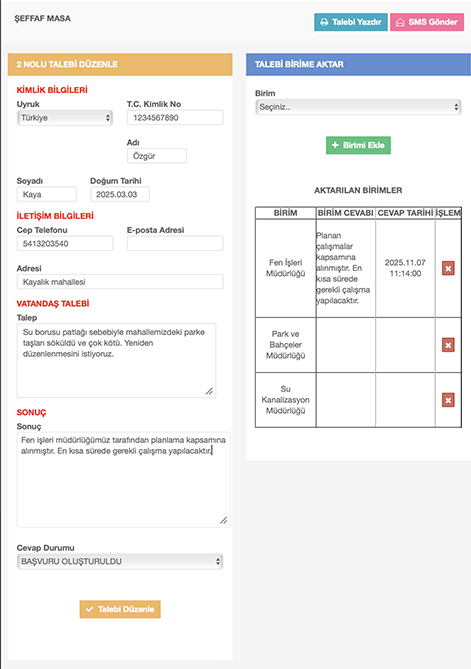 Şeffaf masa modülü ile vatandaş, muhtar taleplerini kayıt altına alabilir, birden fazla birime talebi yönlendirebilir, talep cevaplarını tek bir cevap olarak ister sms ile ister çağrı merkezi ile vatandaşa geri bildirebilirsiniz.