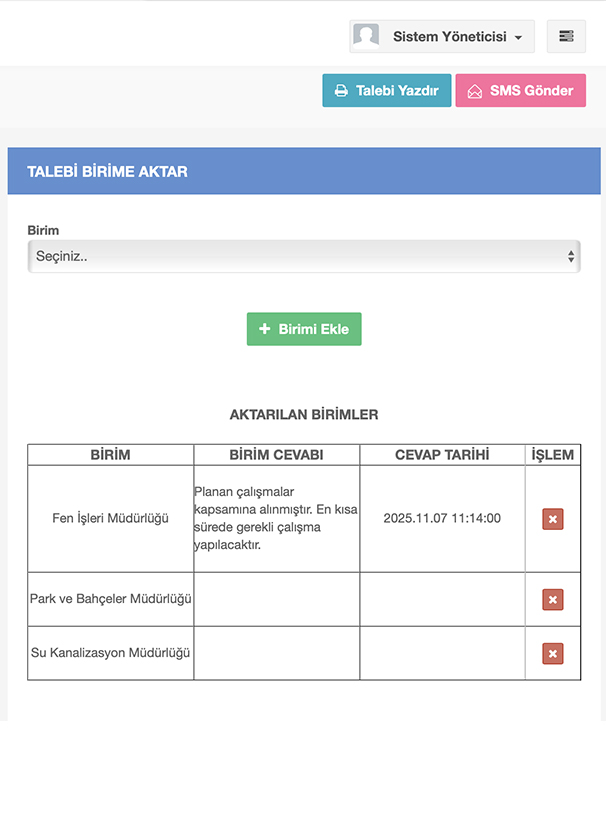 Vatandaş talebi eğer birden fazla birimi ilgilendiriyorsa, talep dağıtımı yapılır, birimlerin verdiği cevaplar tek bir ekranda toplanır.